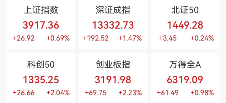 中新经纬12月22日电22日,A股三大指数高开高走,创业板指领涨。截至收盘,上证指数涨0.69%,报3917.36点;深证成指涨1.47%,报13332.73点;创业板指涨2.23%,报3191.98点。